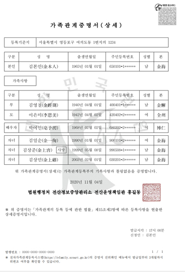 ※ 가족관계증명서 발급예시