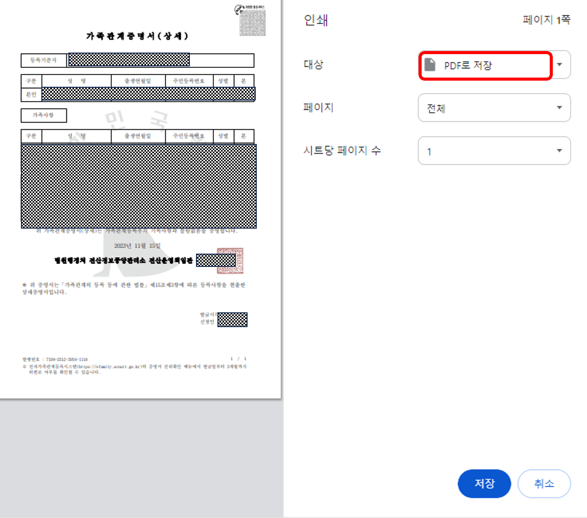 공동인증서나 간편인증 등 원하는 방법으로 본인인증을 하면 왼쪽과 같은 화면이 뜹니다. 발급대상자, 종류 등을 필요에 따라 선택하고 우측 하단 [신청하기]를 클릭하면 오른쪽과 같은 출력화면이 나타납니다. 어디에 직접 제출해야 할 때는 인쇄를 해야겠지만 빨간 네모의 부분의 선택박스에서 'PDF로 저장'을 클릭해서 파일로도 저장이 가능합니다.