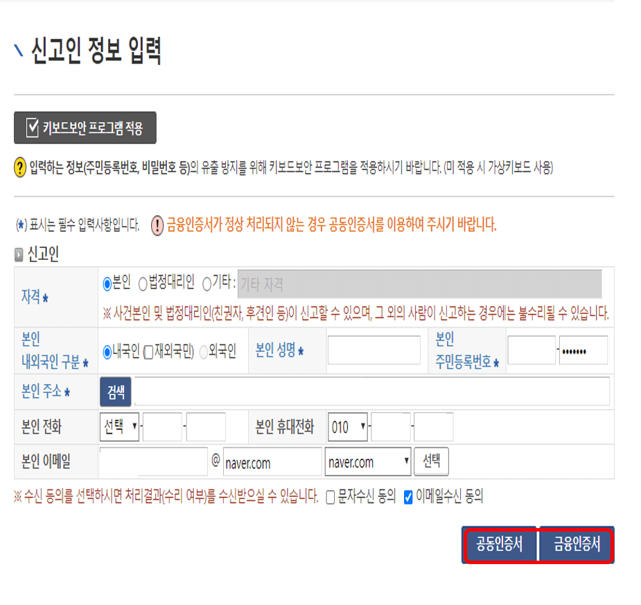 그럼 신고인 정보 입력 화면이 나타나는데요, 주소, 연락처 등을 적고 공인인증서와 금융인증서 중 택하셔서 본인인증을 해줍니다. 그럼 오른쪽과 같은 [개명신고서]나 표시됩니다. 회색화면은 자동으로 입력이 되는 부분이며, 개명 후 이름만 정확히 적어주시고 아래 사건정보에 법원명, 사건번호, 허가일자 등을 기입한 후 [다음 화면]을 클릭합니다.