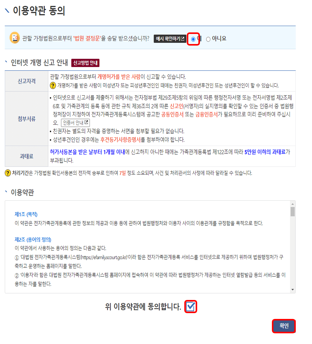 메인 화면에서 좌측 상단 [인터넷신고] - [개명신고]를 선택하면 오른쪽과 같은 화면이 나타납니다. 여기에서 법원 결정문 송달문을 받았다는 [예]에 체크, 약관에 동의하고 [확인]을 누릅니다.