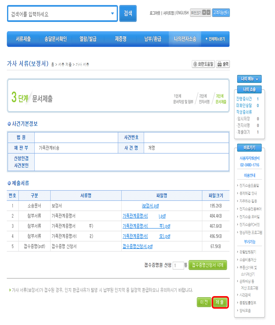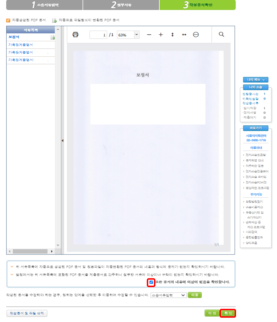 다음 화면에서 왼쪽처럼 본인이 작성한 보정서와 첨부서류를 차례대로 보여줍니다. 확인하고 맞으면 파란색 체크박스 체크, [확인]을 누르면 개명신청할 때처럼 접수증명서를 작성 팝업이 뜹니다. 그럼 이제 오른쪽 화면에서 [제출] 버튼을 누르면 끝입니다.
