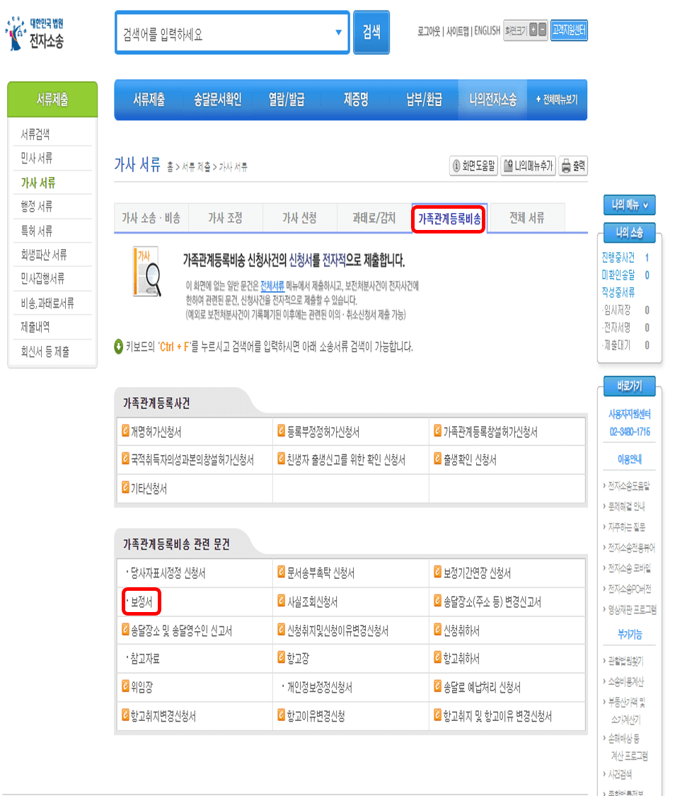 메인화면 좌측 상단의 [서류제출] - [가사서류]를 누른 다음, 다섯 번째 메뉴인 [가족관계등록비송]까지는 개명신청과 동일합니다. 여기에서 지난 번에 '개명허가신청서'를 클릭한 것과 달리 이번에는 아래 메뉴 중 [보정서]를 선택합니다.