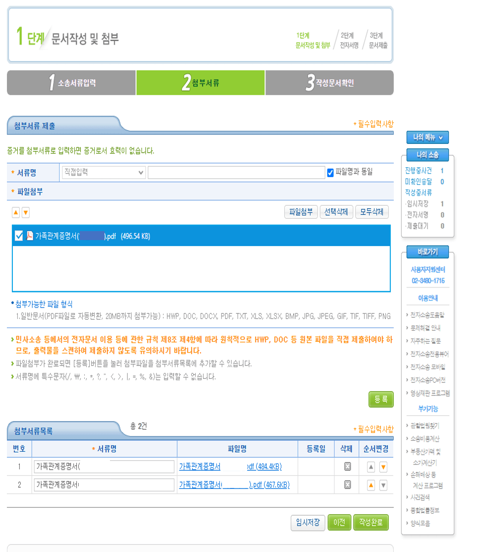 그럼 왼쪽과 같은 메뉴가 나타나는데 여기에서 본인의 사건번호를 선택한 후 [확인]을 누릅니다. 오른쪽과 같은 화면이 나타납니다. 본인이 직접 작성한 보정서와 보정권고 내용에서 요청받은 서류를 차례대로 첨부합니다. 역시 개명신청 했을 때와 방법은 동일합니다. 파일을 다 올렸으면 우측 하단의 [작성완료]를 누릅니다.