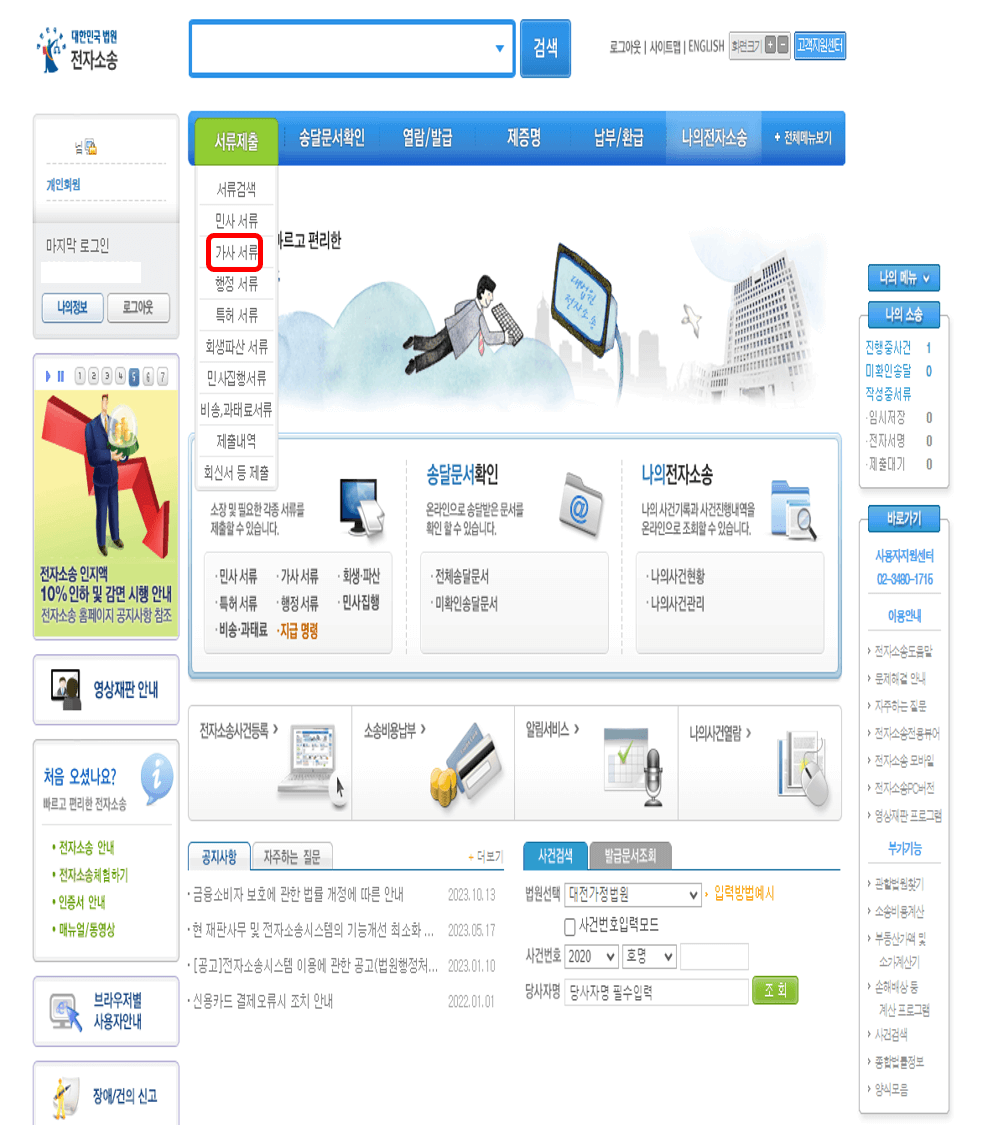 법원에서 보정권고 메일과 문자를 받고 그 내용을 자세히 확인하기 위해서는 개명신청했던 '대한민국 전자소송'사이트에 들어갑니다.