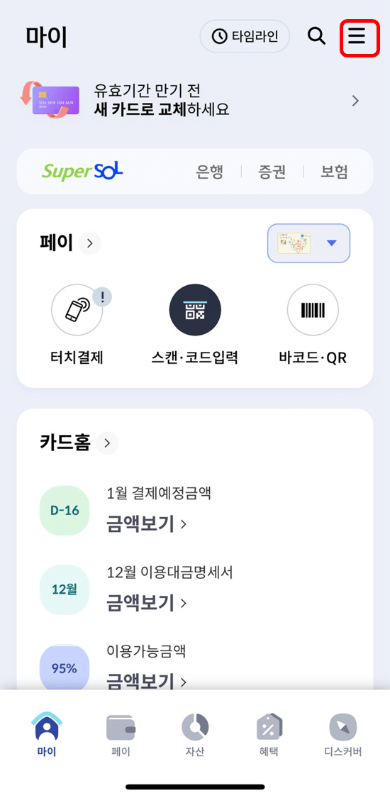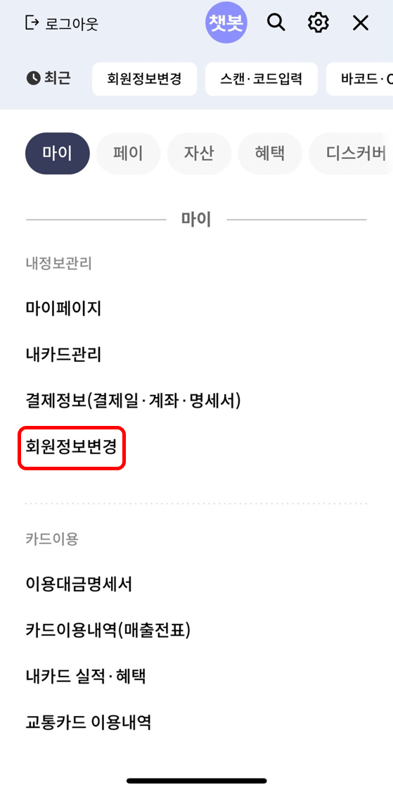 신한카드는 유일하게 고객센터 외에 어플에서 변경이 가능합니다. 전화를 안 좋아하는 사람들은 다른 회사보다 편리하게 이용할 수 있을 것 같습니다.