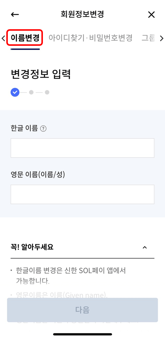 1) [신한솔페이] 어플에서 이름 변경