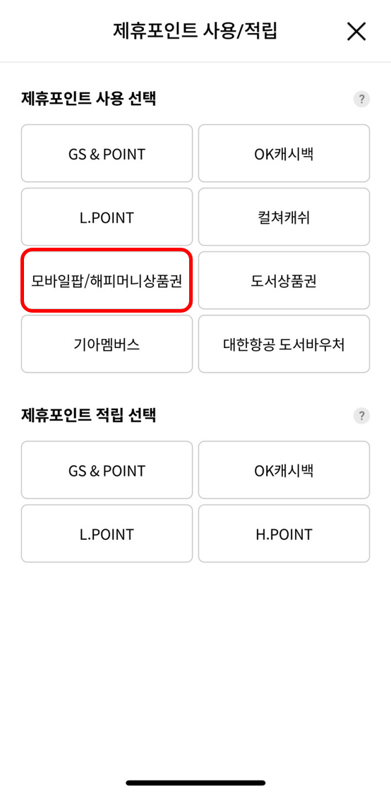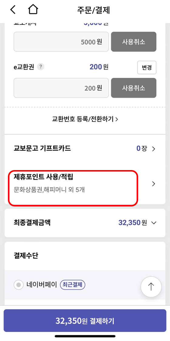 인터넷으로도 같은 방법이지만 이 글에서는 '모바일 교보문고'를 예로들어 설명드리겠습니다. 왼쪽 그림이 모바일 교모문고의 결제화면 모습입니다. 여기에서 중간 쯤 [제휴포인트 사용/적립]을 선택, 다음 화면에서 [모바일팝/해피머니상품권]을 클릭합니다.