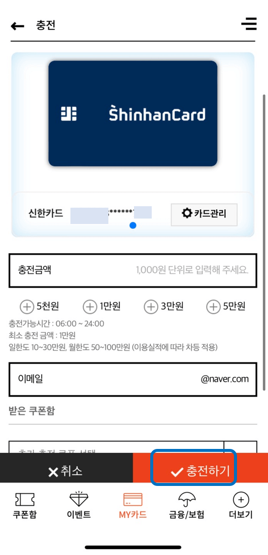 카드정보가 저장되면 왼쪽과 같은 화면에서 충전할 금액 선택 후 [충전하기]를 누르면 오른쪽 그림처럼 '충전 완료'메시지가 표시됩니다. 참고로 충전은 1만원 이상 결제되며, 천원 단위로 가능합니다.