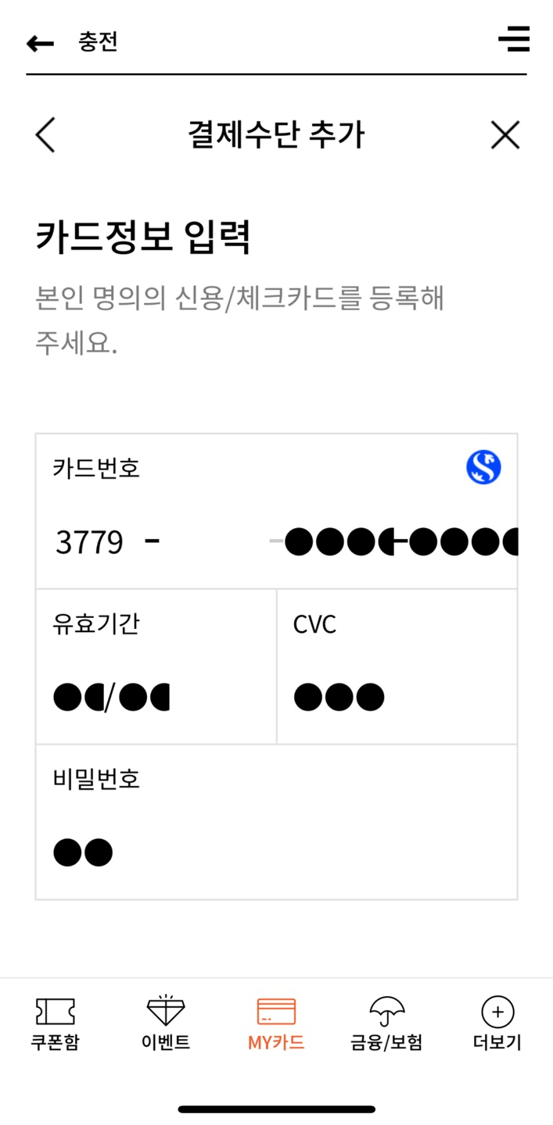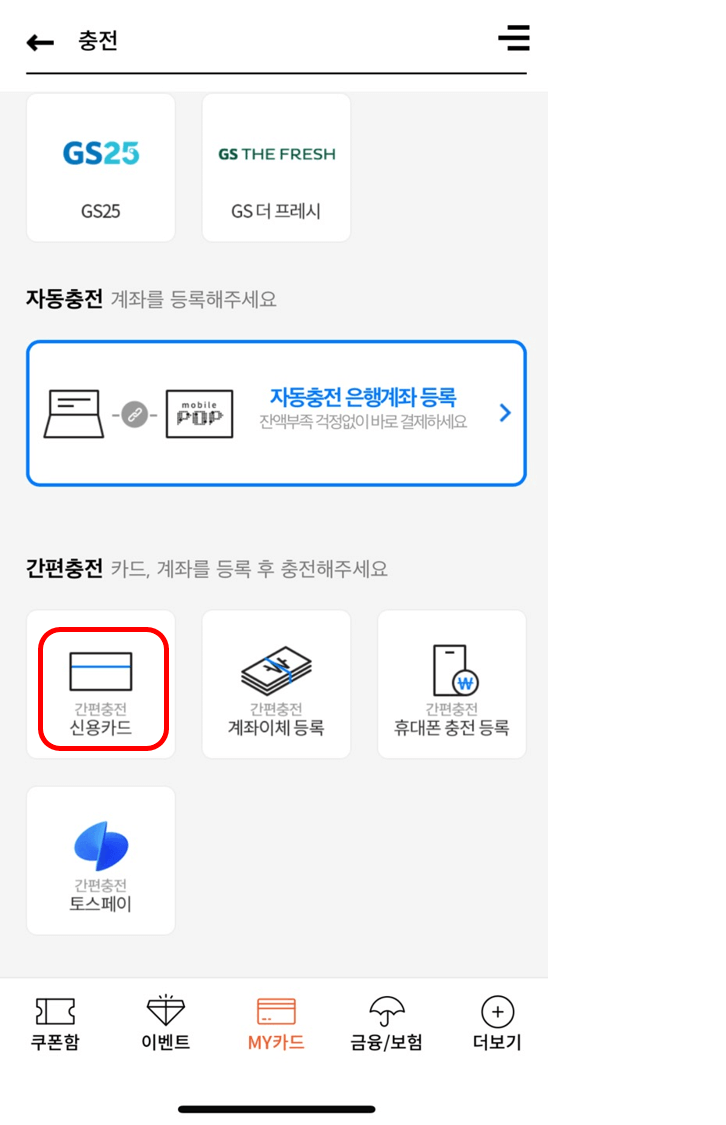 모바일팝은 충전, 결제 방법으로 진행이 됩니다. 우선 맨 왼쪽과 같은 메인화면 중간에 위치한 [잔액충전]을 누릅니다. 다음 화면에서 충전 결제방법을 선택하는데, 이번 글에서는 신용카드를 이용한 방법을 예시로 들겠습니다. 중간쯤 위치한 [신용카드]를 선택, 다음 화면에서 카드정보를 입력합니다.