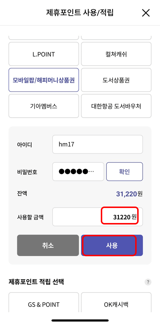 그 다음 모바일팝에서 복사한 아이디와 비번을 차례로 붙여넣기 한 후 [확인], 사용할 금액을 적어주고 [사용]을 선택 후 아래에 있는 [0원 결제하기]버튼을 누르면 끝입니다.