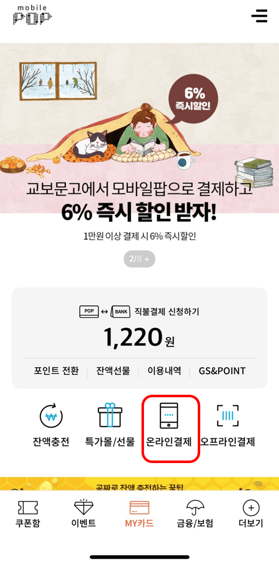 그럼 모바일팝이 무엇이냐? GS 편의점에서 팝카드에서 들어보셨을텐데요, 같은 계열의 휴대폰 어플이라고 생각하시면 됩니다. 팝카드가 없어도 간단하게 어플을 설치하시면 누구나 할인 받을 수 있습니다. 인터넷 교보문고에서 모바일팝으로 결제 시 1만원 이상이면 6%가 즉시 할인됩니다. 이 혜택이 왜 좋냐하면 다음과 같은 이유들 때문입니다.