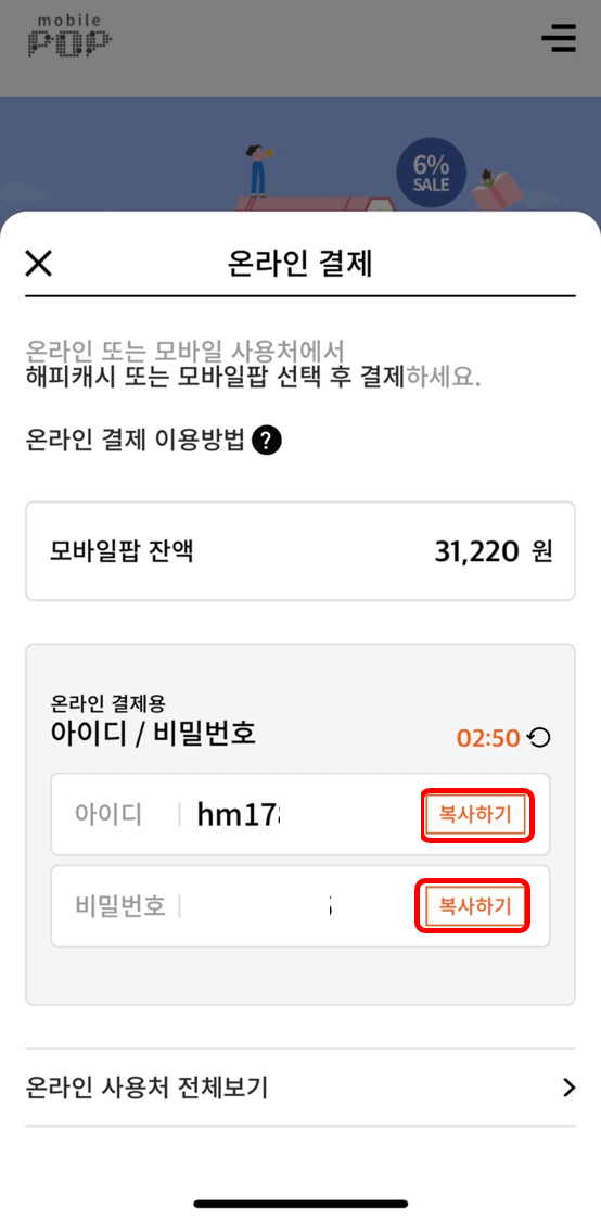그 다음 다시 모바일팝에서 메인화면에서 [온라인결제]를 선택하면 온라인 결제 아이디와 비밀번호가 팝업되며 표시됩니다. 이것은 1회용으로 랜덤으로 지정되는 것이고 사용자가 임의로 지정할 수는 없습니다. 아이디와 비번 옆에 써있는 [복사하기]를 이용하여 모바일 교보문고 결제창에 붙여넣기를 하면 쉽게 이용할 수 있습니다.