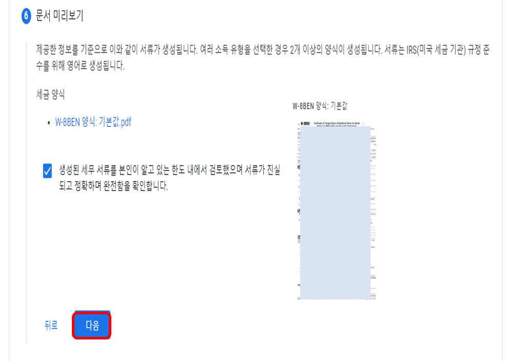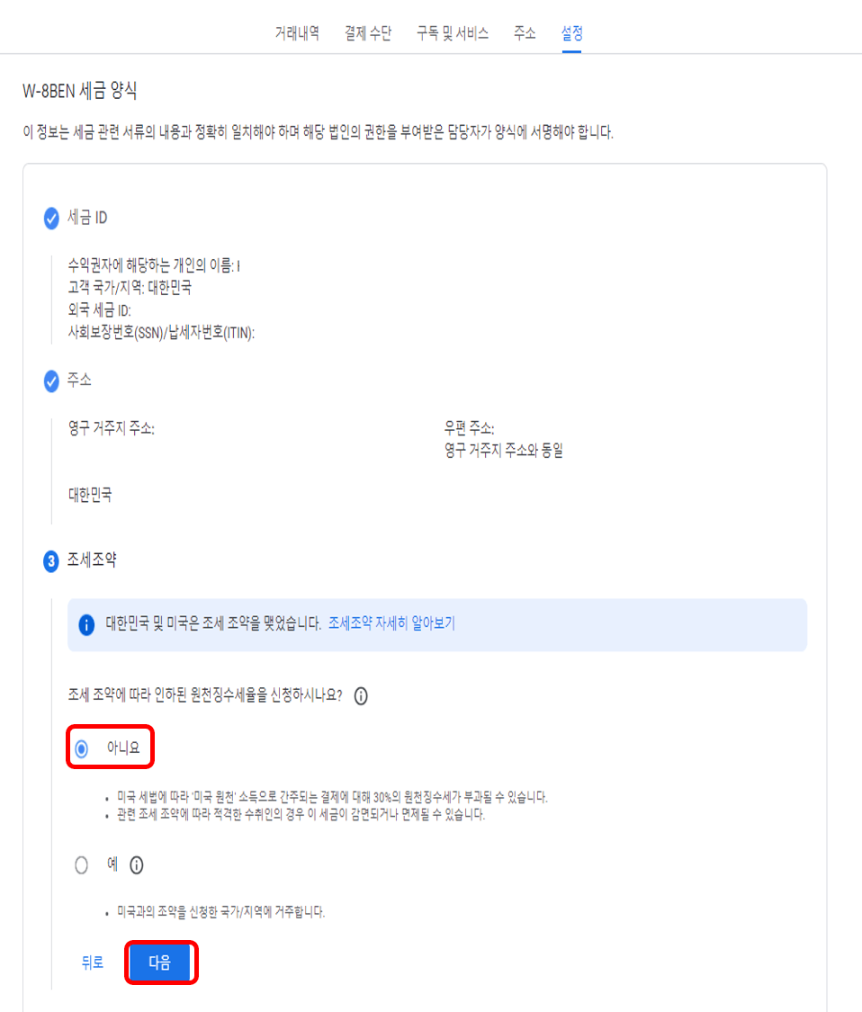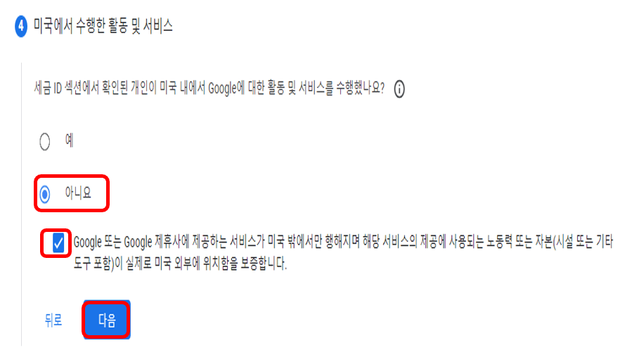 조세조약에 따라 인하 원천징수 세율을 신청하냐는 질문에는 [아니오]를 선택합니다(개인의 경우). [다음]을 누르고 미국에서 활동하냐는 질문에는 [아니오], 아래 체크박스에 체크 후 [다음]을 누릅니다.