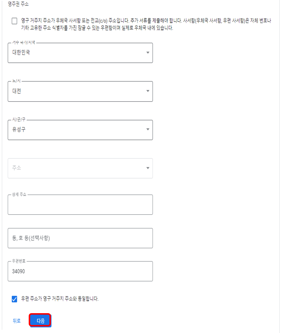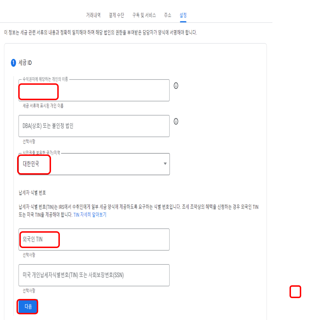 다음 수취인 이름은 영문명을 써줍니다. 이 이름과 프로필 상 이름이 일치해야 하며, 일치하지 않을경우 여권 등 증명할 수 있는 서류를 제출해야 할 수도 있습니다. 시민권 보유국가에 [대한민국], 외국인TIN은 사업자등록증이 없는 분들은 비워두시면 됩니다. 잘못 된 정보로 주민등록번호를 적으라는 분들이 계신데, 아닙니다. 그리고 [다음]을 누릅니다.