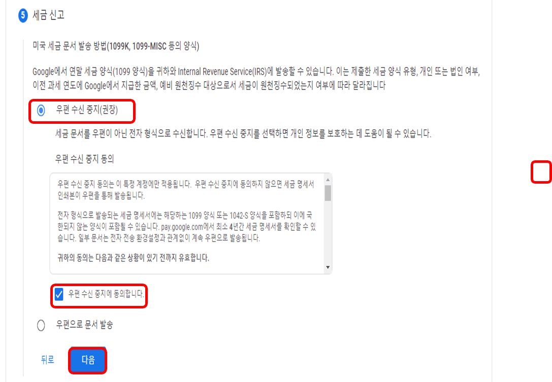 다음 하면에선 [우편수신 중지(권장)]을 선택, 아래에도 다시 한번 체크 후, [다음]을 누릅니다. 요즘 한 집에서 오래 사시는 분들 많이 없으시죠. 우편수신 중지를 선택해야 이메일로 받을 수 있으므로 우편수신 중지를 추천드립니다. 다음 화면에서 그 동안 작성했던 양식이 표시되고 체크박스에 체크, [다음]을 선택합니다.