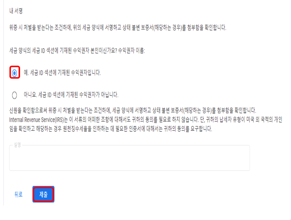 무시무시한데요, 위증 시 처벌받을 수 있다든 어구에 체크합니다. 아래에 상태불변진술서는 지금 작성하는 양식을 이전 결제에 적용할 수 있다는 내용인데요, 그 전에 수익이 없다면 굳이 작성하지 않고 비워두셔도 됩니다. 마지막 페이지에서 본인이 맞다는 위의 어구에 체크, [제출]을 누르면 완료됩니다.