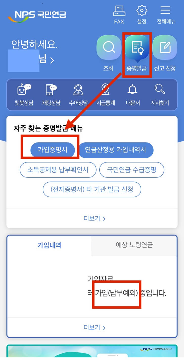 왼쪽과 같은 어플의 메인화면 중앙에 '납부예외' 중이라는 글귀에서 현재 가입상태를 확인할 수 있습니다. 또한, 우측상단의 [증명발급] - [가입증명서]를 차례로 누르면 다음 화면에서 전체 가입내역이 쭉 나열되며 현재기간에서 '납부예외'임을 확인할 수도 있습니다.