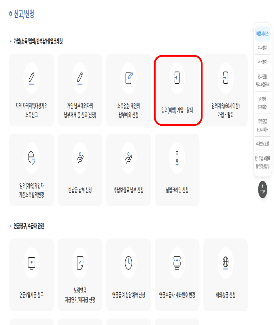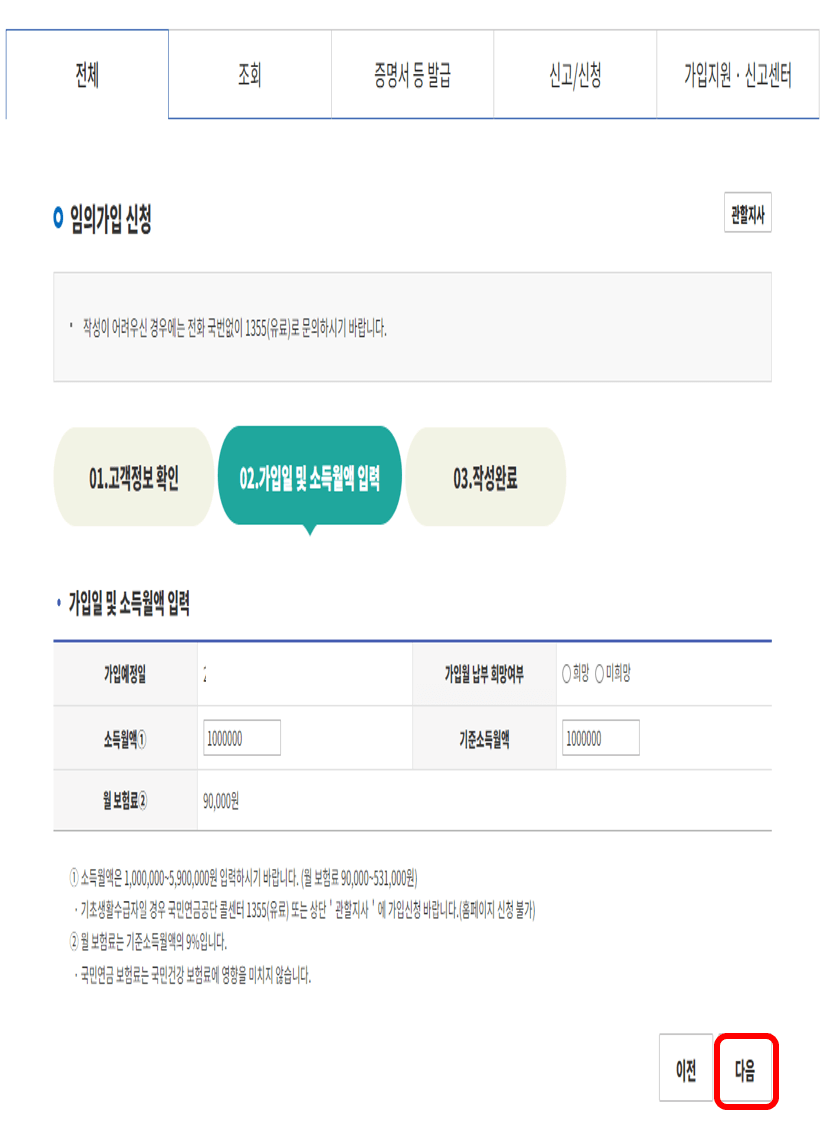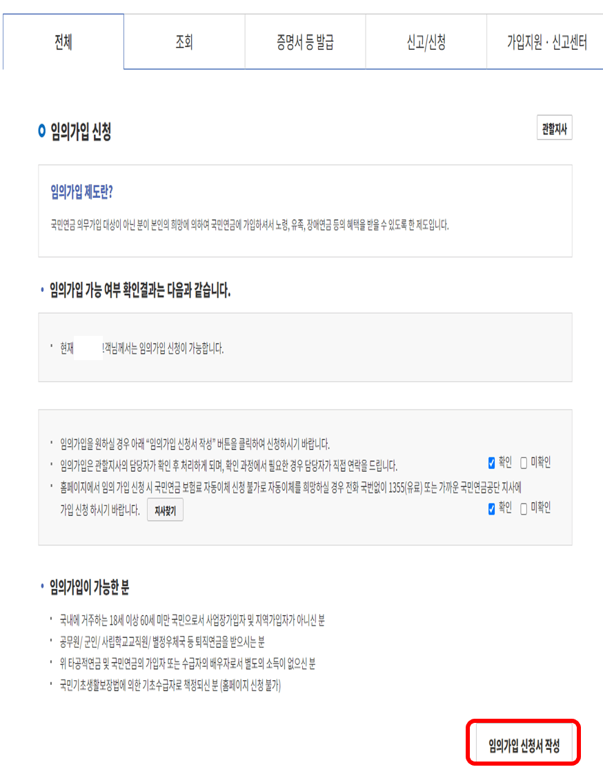 임의가입 방법은 전화나 방문, 또는 어플로 신청하는 방법도 있겠으나 홈페이지에서 하는 법으로 알려드리겠습니다.