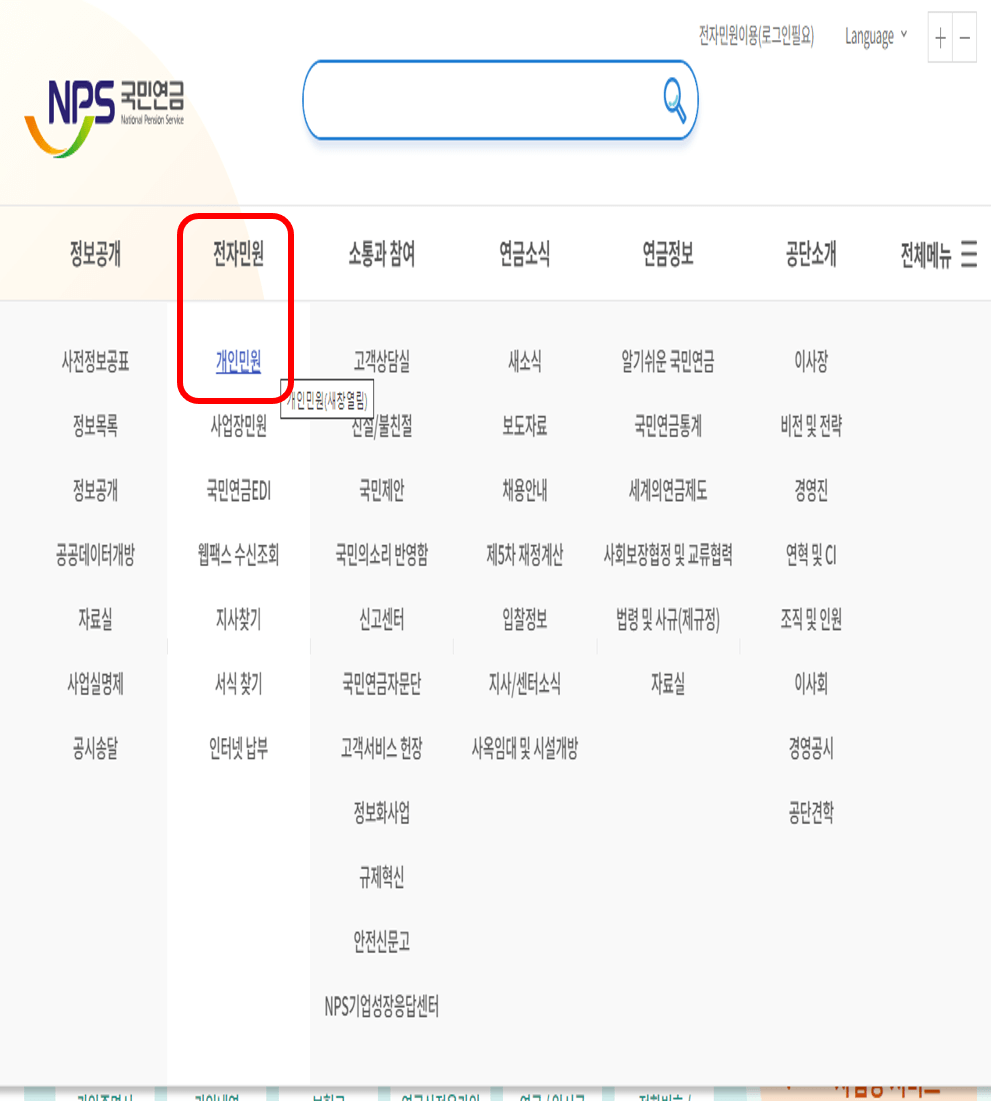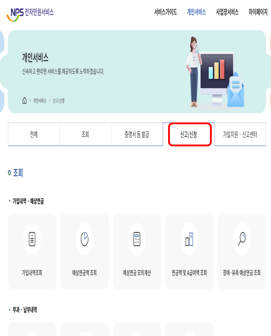 먼저, 국민연금홈페이지에 접속 한 후 상단 맨 왼쪽 [전자민원]-[개인민원]을 선택합니다. 그러면 로그인 창이 뜨게 되는데, 이때 본인이 원하는 방식으로 로그인하게 되면 오른쪽과 같은 창이 뜹니다. 여기에서 왼쪽에서 네 번째 탭인 [신고/신청]을 선택합니다.