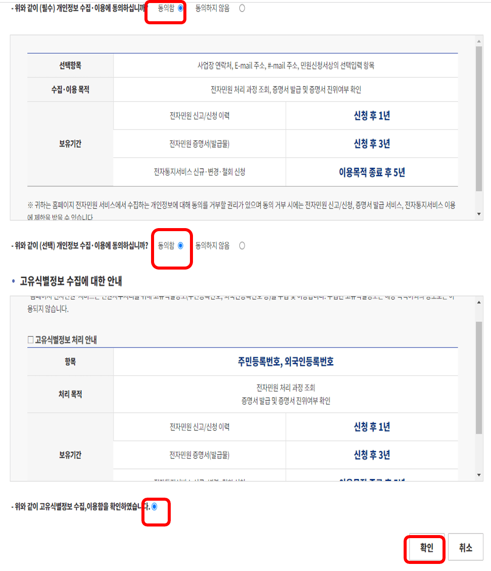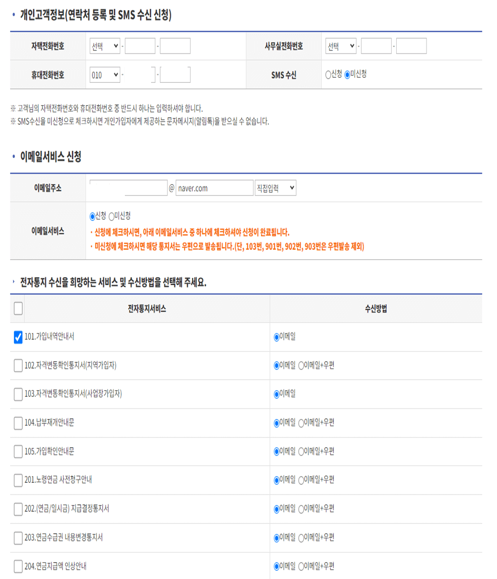 여기에서 약간 확인작업을 하는 듯한 동그라미가 표현되고 얼마 후, 왼쪽과 같은 창이 뜹니다. 임의가입이 가능하다는 메시지가 있다면 아래 내용에 확인을 누른 후 임의가입 신청서 작성을 클릭합니다. 그럼 오른쪽과 같은 창이 뜨게 되는데, 개인의 기호에 따라 수신방법을 선택한 후, 아래 확인버튼을 클릭합니다.