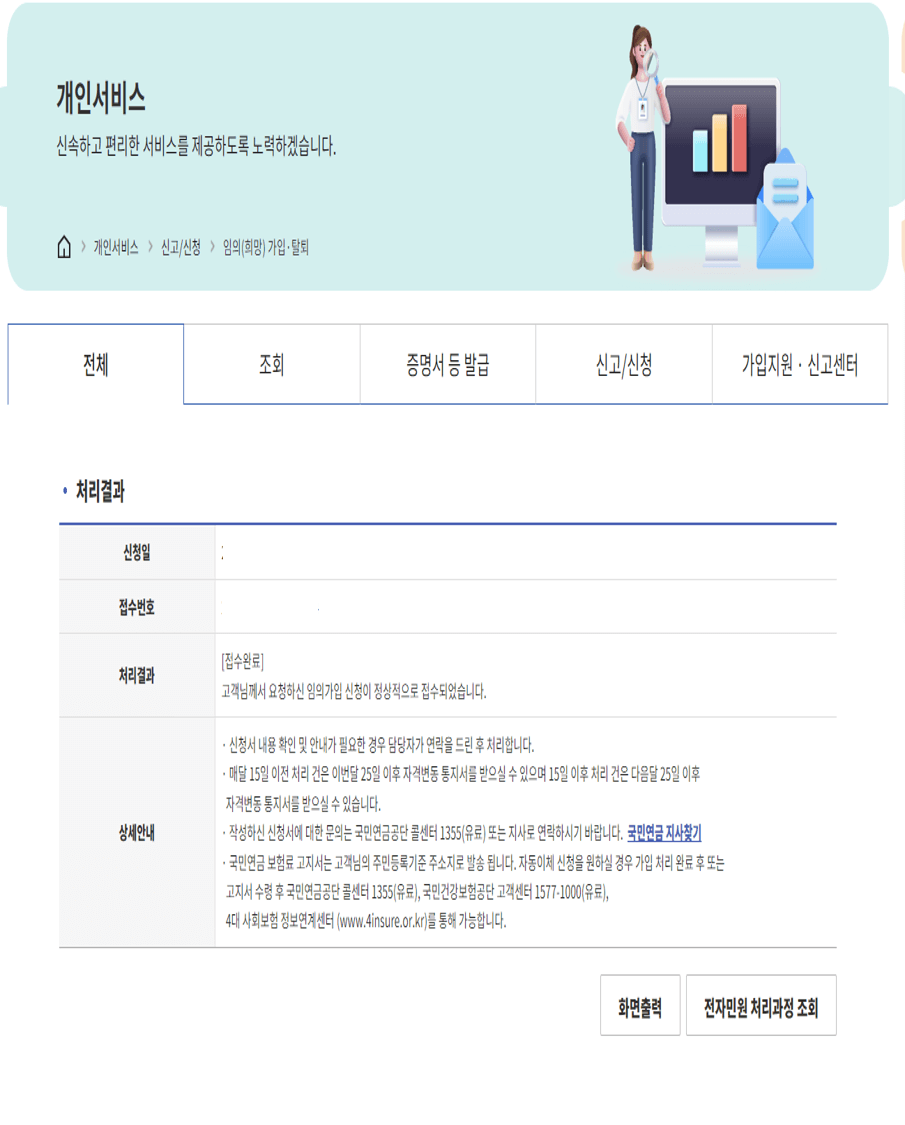 퇴직처리가 되면 얼마 후 국민연금공단에서 문서가 하나 날아옵니다. 이름하여 「사업장상실자 임의가입 안내문」이라는 제목의 문서인데요, 회사원 신분일 때 회사와 근로자가 반반 부담했던 국민연금을 '임의가입' 신청을 하여 계속 이어가라는 취지의 내용입니다. 수입이 없다면 '납부예외' 조건에 해당이 되므로 '납부예외' 신청을 하면 되지만 노후보장을 위해 적은 금액이라도 가입하는 방법을 추천드립니다.