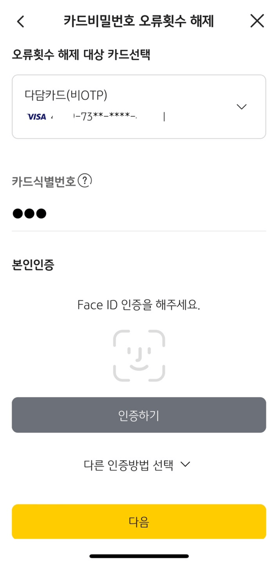 다음 화면에서 중간쯤 [비밀번호 오류횟수 해제]를 누르면, 다음 화면에서 오른쪽과 같은 화면에서 해당카드를 선택하고 인증 후 [다음]을 누르면 됩니다.