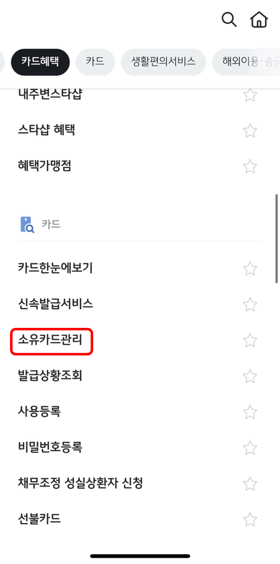 일단 로그인을 한 후, 왼쪽과 같은 메인화면에서 우측 상단 [줄 세개]를 누릅니다. 다음 화면에서 중간 윗 부분에 있는 [카드]를 선택합니다. 거기서 쭉 스크롤을 내리면 중간 쯤 [소유카드관리]가 있습니다.