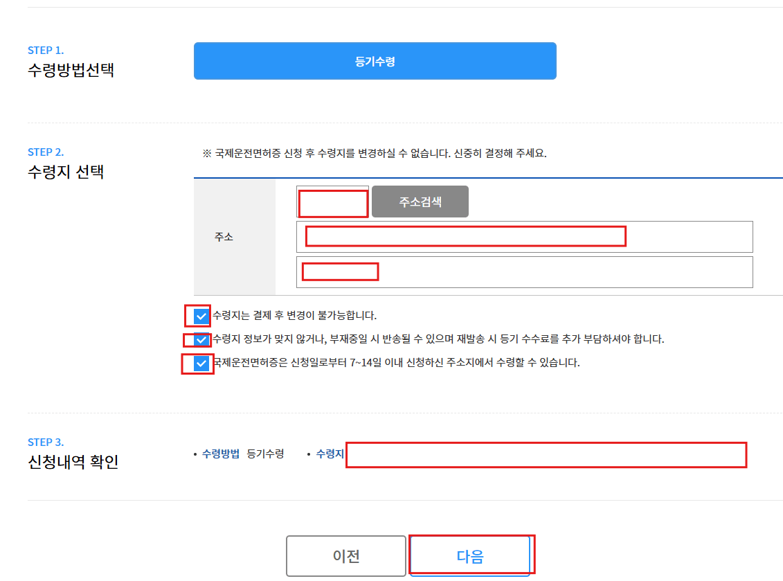 수령방법은 등기로만 가능하며 변경 불가합니다. 왼쪽과 같은 화면에서 수령지 주소를 적은 후 체크박스 세 개 체크, 하단 [다음]을 차례로 선택합니다. 다음 화면에서 SMS와 이메일로 알림 수신 여부 선택, 전 단계 이동 불가 동의에 체크, [다음]을 클릭합니다.