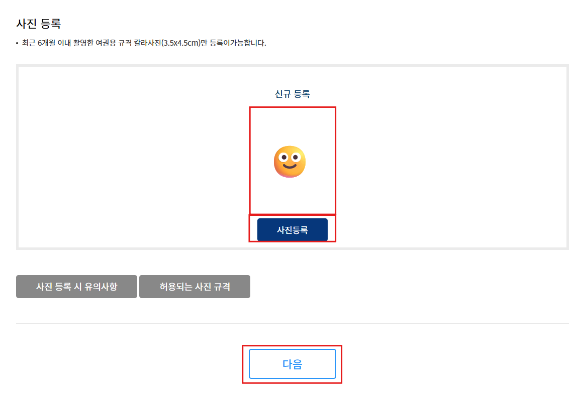 - 사 진 : 최근 6개월 이내 촬영한 여권용 규격 칼라사진(3.5 × 4.5㎝)