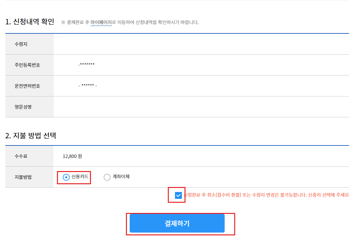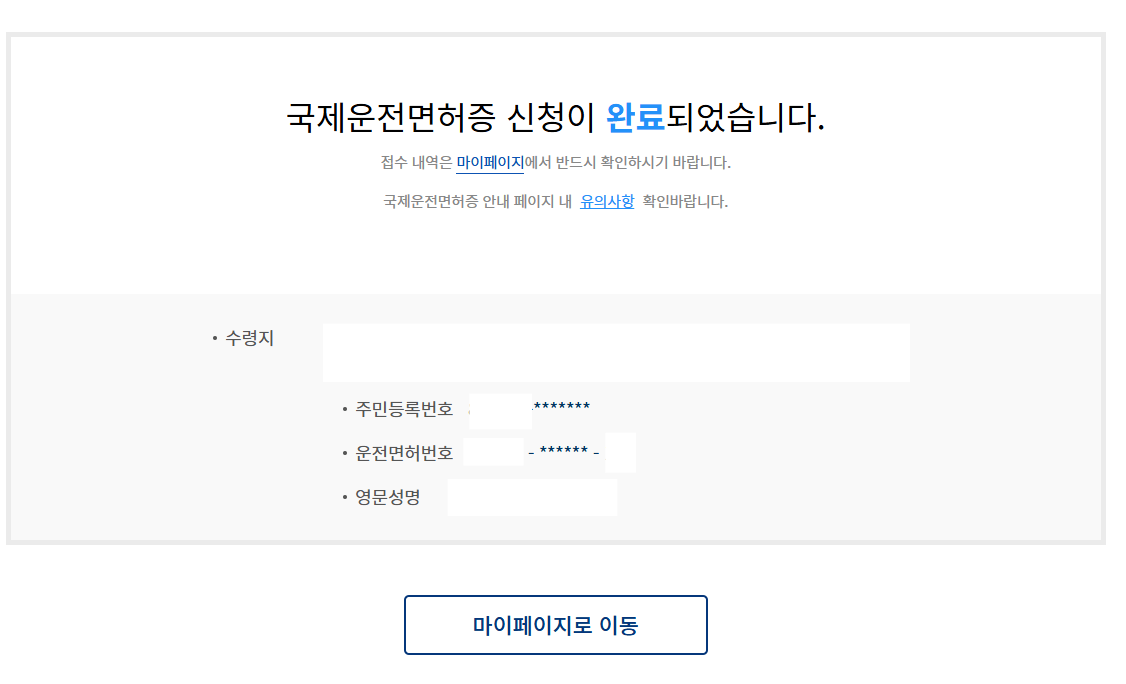 그럼 위와 같이 신청 완료 메시지가 뜨며 주민등록번호와 운전면허번호, 영문성명 등이 한 번 더 표시됩니다. 이제 신청은 완료되었으므로 등기가 올 때만 기다리면 됩니다.
