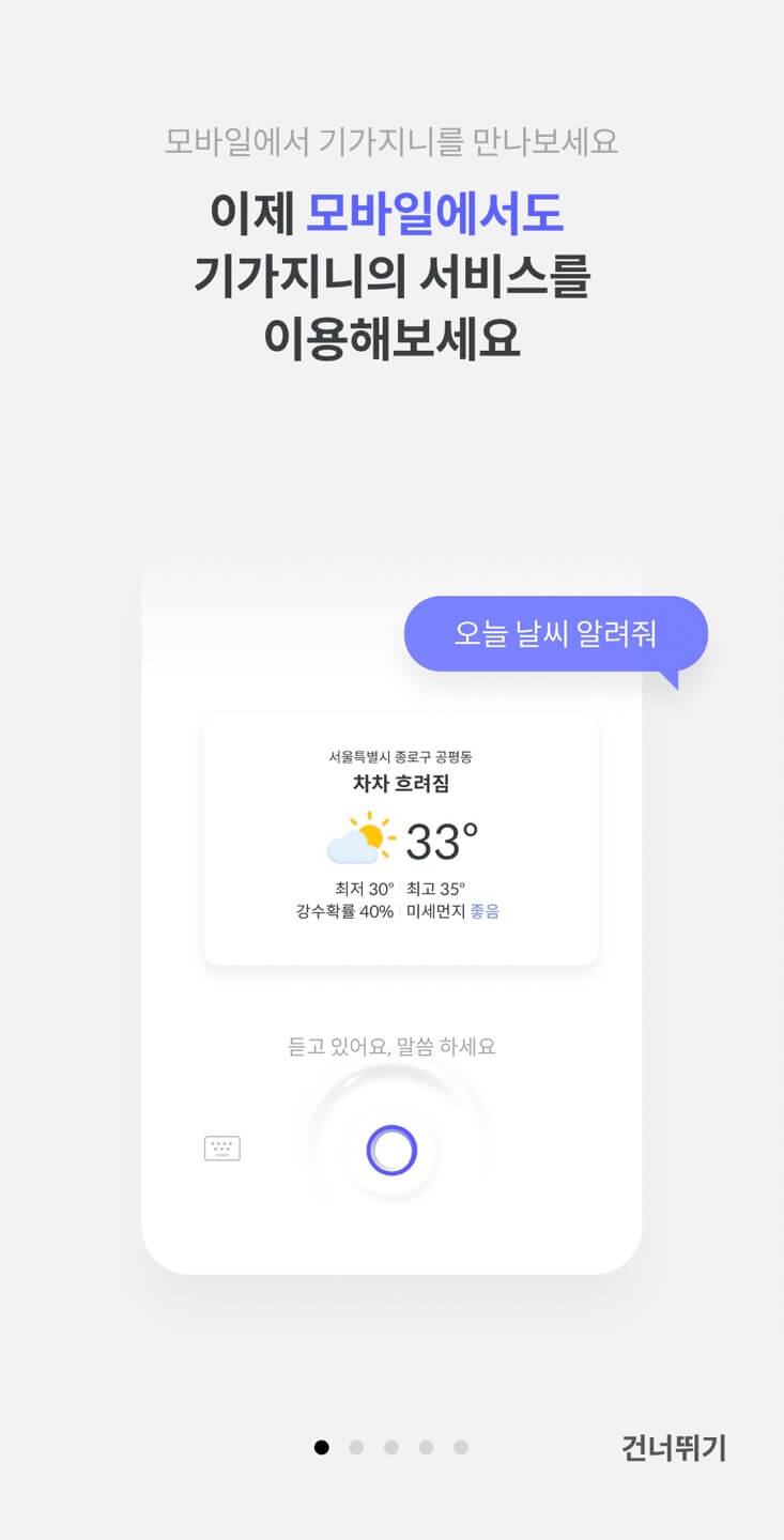 플레이스토어나 앱스토어에서 '기가지니'를 검색해서 왼쪽 그림과 같은 어플을 설치합니다. 그럼 오른쪽 같은 화면이 나오는데 우측하단 [건너뛰기]를 누르셔서 메인화면으로 가셔도 됩니다. 메인화면이 나왔다면 먼저 [로그인]을 진행합니다.