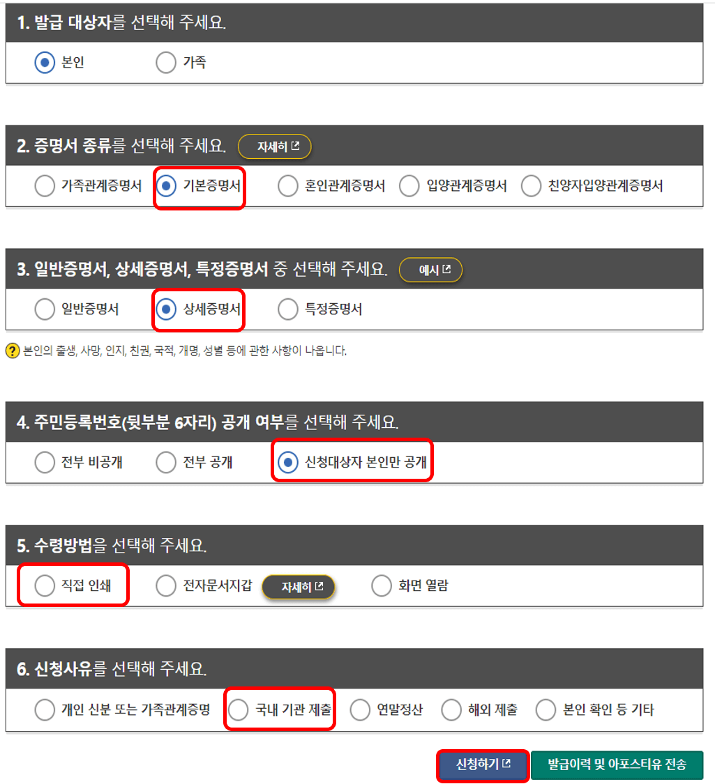 이제, 신청 마지막 페이지인데요, [본인] - [기본증명서] - [상세증명서]를 차례대로 선택합니다. 4번 주민번호 뒷번호는 본인의 인적사항의 변경만을 위한 것이므로 [신청대상자 본인만 공개]를 선택합니다. 다음에 [직접 인쇄] - [국내 기관 제출]을 선택하고 아래 [신청하기]버튼을 누르면 인쇄 페이지로 넘어가게됩니다.