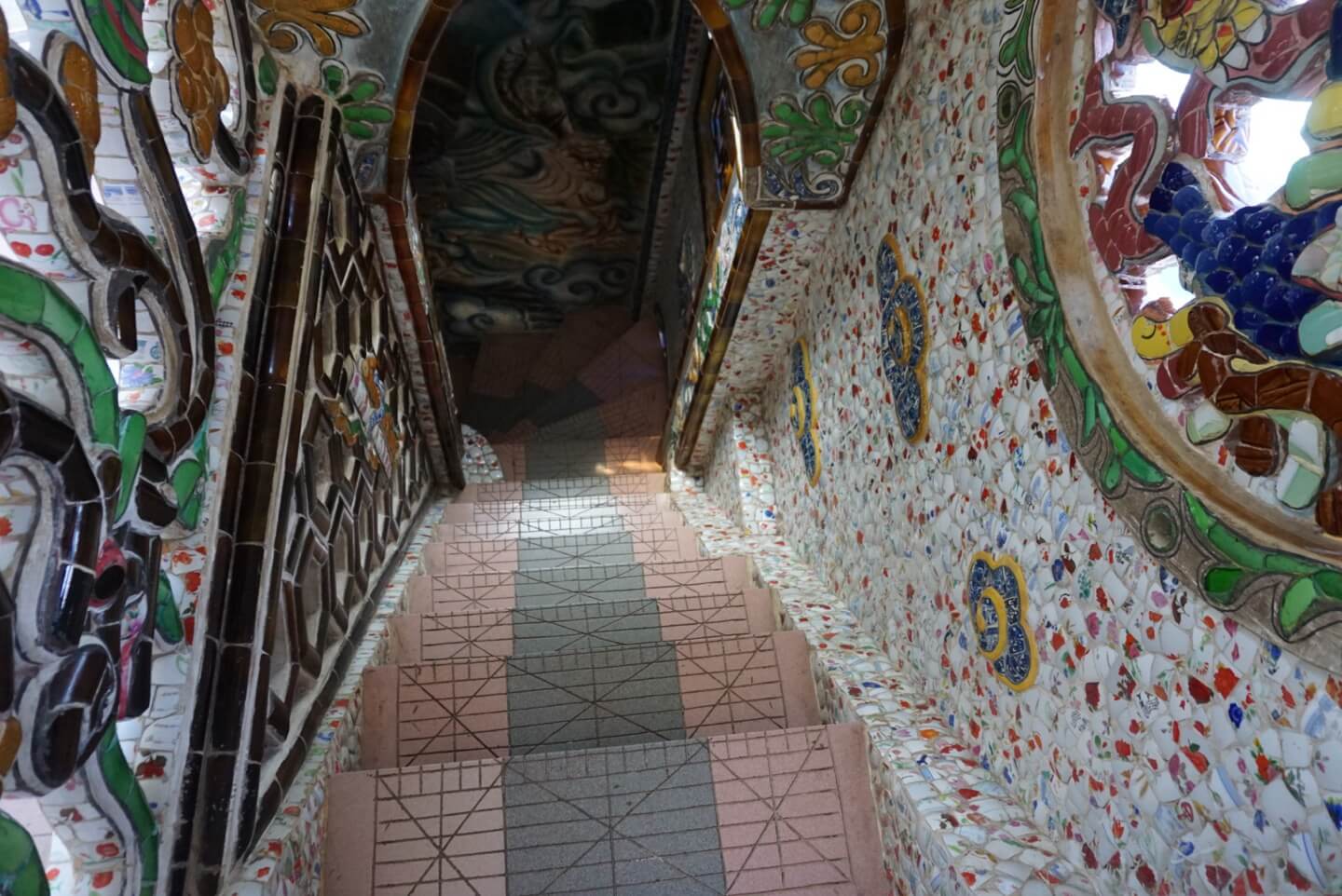 나트랑 달랏 일일투어의 첫 번째 코스는 린푸억사원입니다. 사진에서 보다시피 무척 화려한 사원으로, 유리와 도자기 조각을 이어 붙인 사원입니다. 오른쪽 사진은 계단을 위에서 내려다보면 찍은 건데요, 무척 가팔라서 올라가거나 내려갈 때 주의하셔야 할 정도입니다. 2층에 작은 쪽지에 소원을 적고 붙인 후, 종을 세 번 울리면 소원이 이루어진다는 속설이 있어 올라가면 실제로 많은 소원 쪽지가 붙여져 있습니다. 간 김에 소원을 적고 종을 울리는 것도 좋은 추억이 될 것 같습니다.