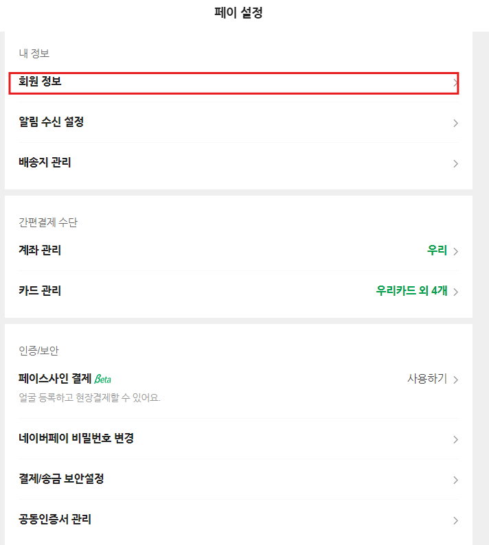 왼쪽 그림과 같은 [페이 설정] 화면에서 [회원정보] - 다음 화면에서 [휴대전화 번호]를 선택합니다.