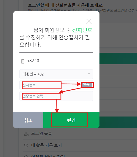 그럼 그림과 같은 팝업창이 나타나는데요, 여기에 변경된 [전화번호 입력] - [인증] - [인증번호 입력] 후, [변경] 버튼을 누르면 완료됩니다.