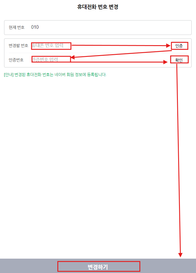 여기에서 네이버ID 변경할 때와 동일하게 변경할 번호에 [전화번호 입력] - [인증] - [인증번호 입력] - [확인]을 클릭 후, 아래 [변경하기]를 차례대로 눌러 완료합니다.