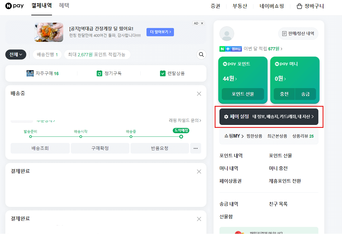 왼쪽과 같은 네이버 메인화면에서 [네이버페이]로 들어가야 하는데요, 이때 두 가지 방법이 있습니다. 좌측 상단 '줄 세 개' 옆 [네이버페이] 아이콘을 통해서, 또는 중앙에 있는 [네이버페이] 메뉴를 이용할 수 있습니다. 그럼 오른쪽 그림과 같은 화면이 나오는데요, 우측 중간 쯤 검은색 바탕의 [페이 설정]을 클릭합니다.