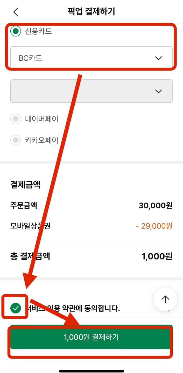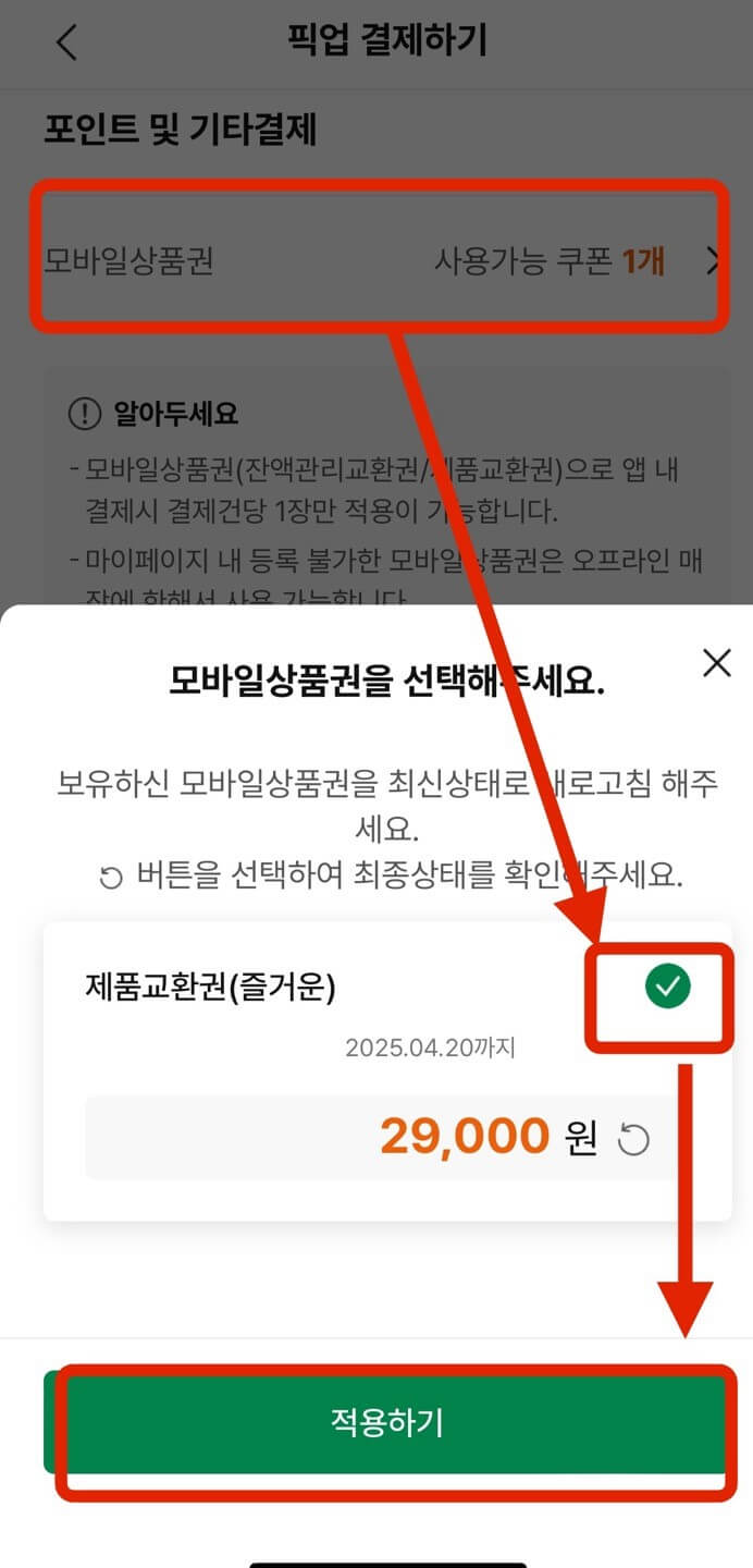 아래로 조금 내리다보면 [모바일 상품권]이 있는데, 그 버튼을 선택하면 위에서 등록한 기프티콘이 표시됩니다. 해당 기프티콘 [체크박스] 클릭, 아래 [적용하기]를 누릅니다. 부족한 금액은 신용카드나 기타 결제방식으로 결제하면 완료됩니다.