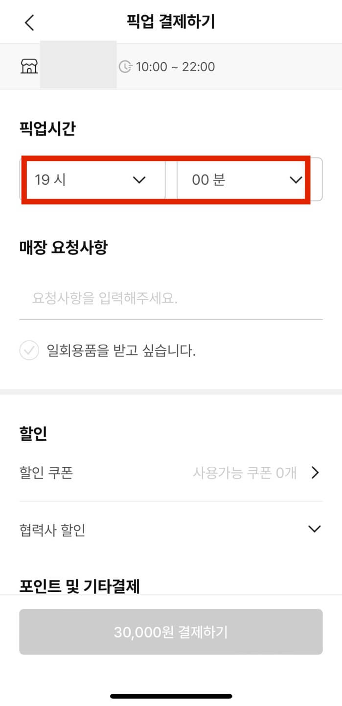 원하는 메뉴를 장바구니에 담고, 가까운 매장을 선택한 후 왼쪽과 같은 장바구니 메뉴에서 아래 [주문하기]를 누릅니다. 만약 픽업을 선택하셨다면 오른쪽과 같은 화면에서 [픽업시간]을 설정합니다.
