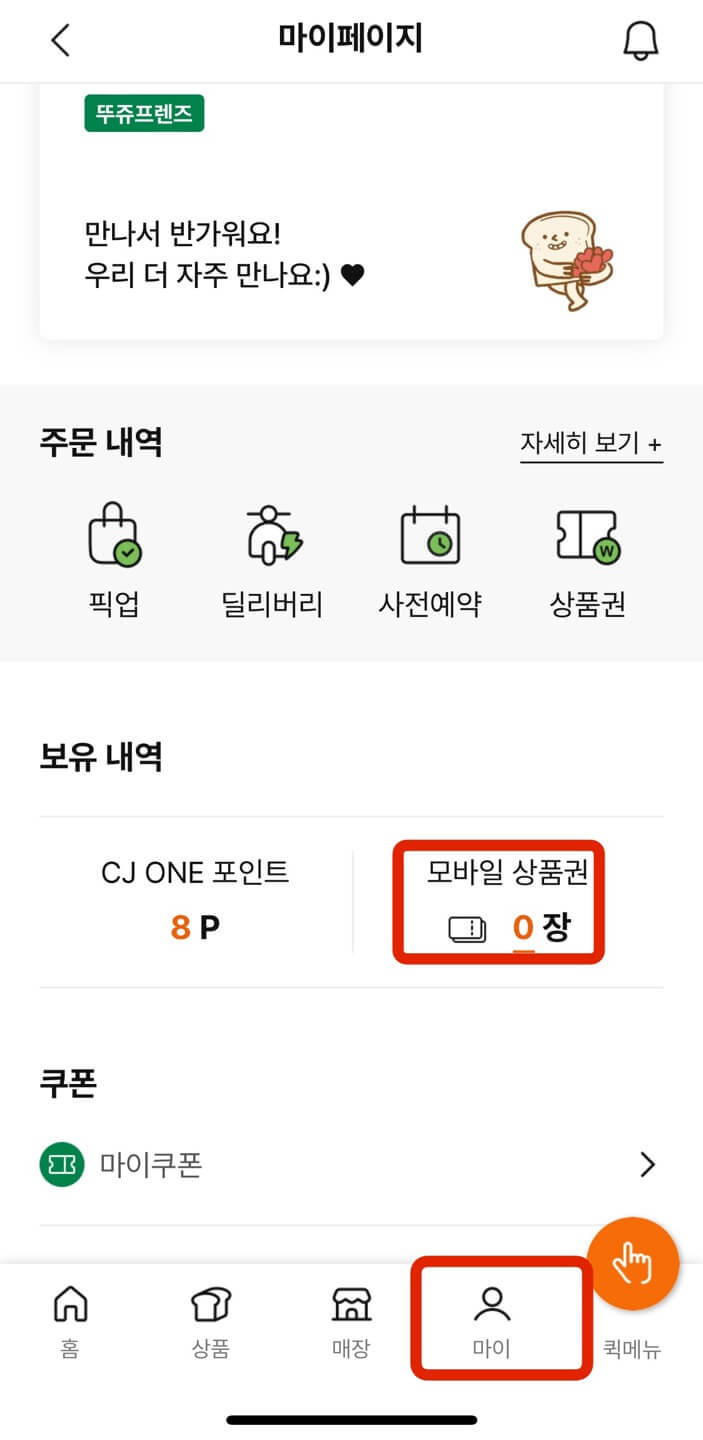위와 같이 기프티콘을 뚜레쥬르 어플에 등록했다면 주문하러 가야겠죠.
