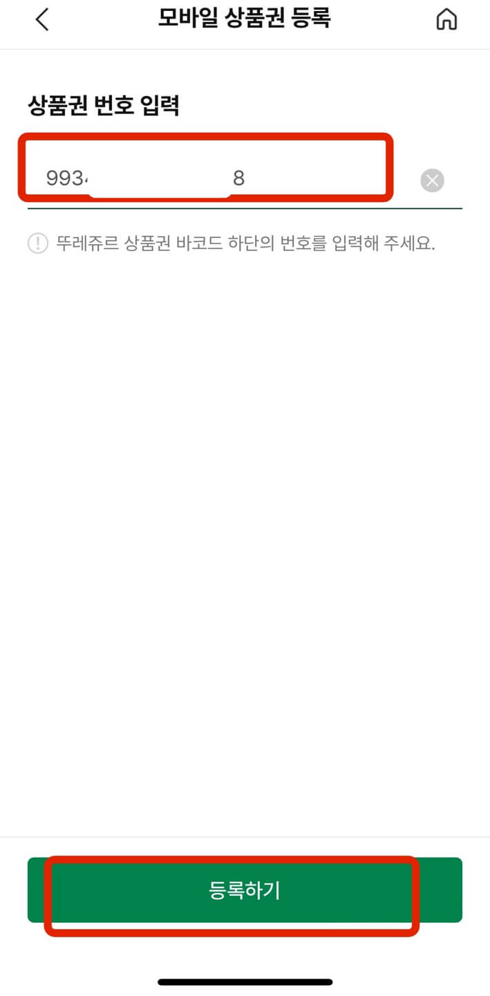 뚜레쥬르 어플을 설치하고 로그인 후, 우측 하단 [마이]를 누르면 1번과 같은 그림이 표시됩니다. 중간쯤 [모바일 상품권]을 눌러 2번과 같은 화면에서 선물로 받은 기프티콘 번호를 입력, 아래 [등록하기]를 누릅니다.