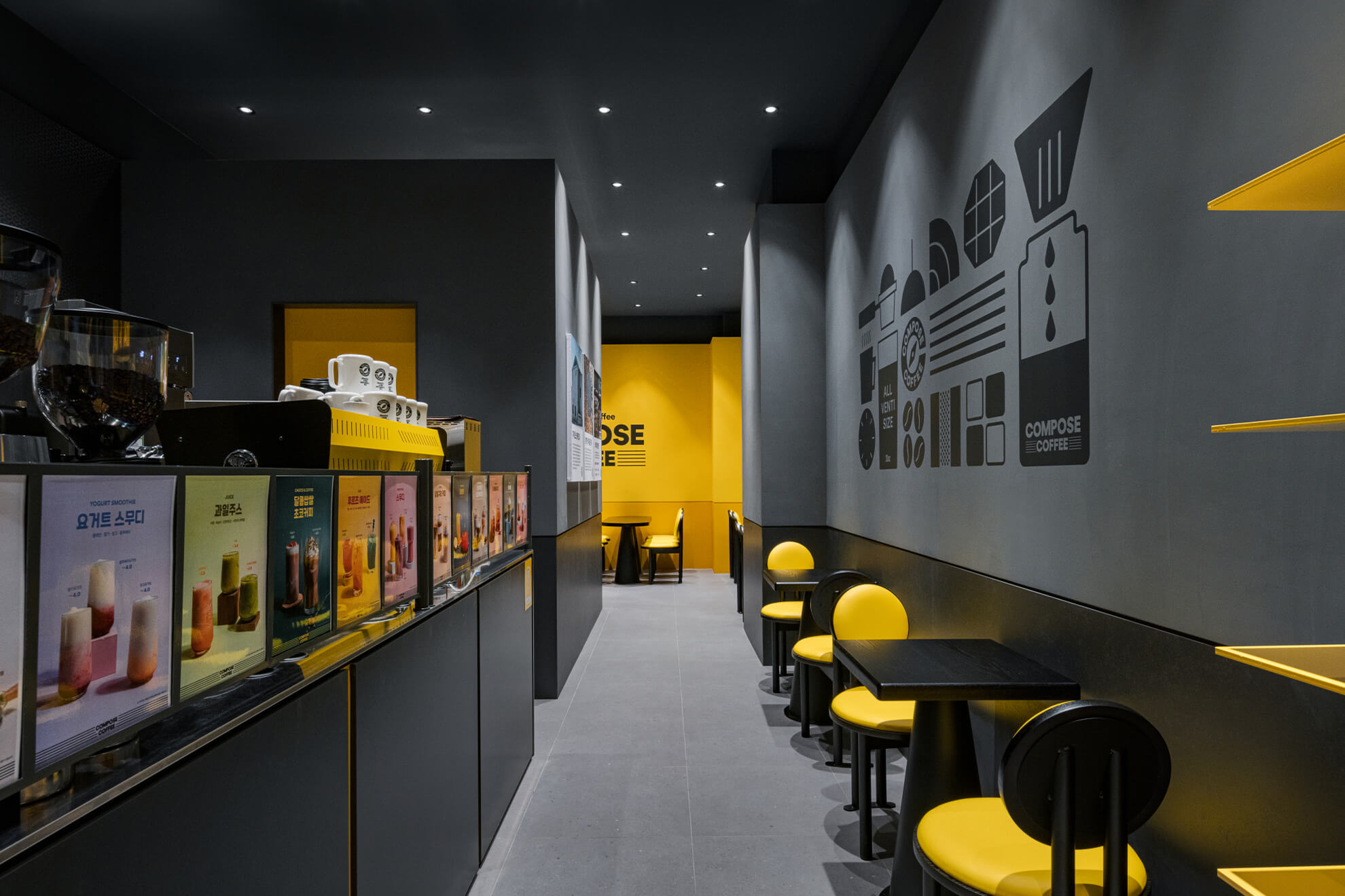 메가커피와 컴포즈커피의 인테리어에 사용하는 색상의 공통점은 노란색을 주요색으로 사용한다는 점입니다. 약간의 차이가 있다면 메가커피는 노란색과 흰색을 적절히 사용하여 조금 더 밝은 느낌을 주는 반면, 컴포즈커피는 노란색과 검은색에 가까운 어두운 회색을 섞어서 조금 더 세련된 느낌을 줍니다.