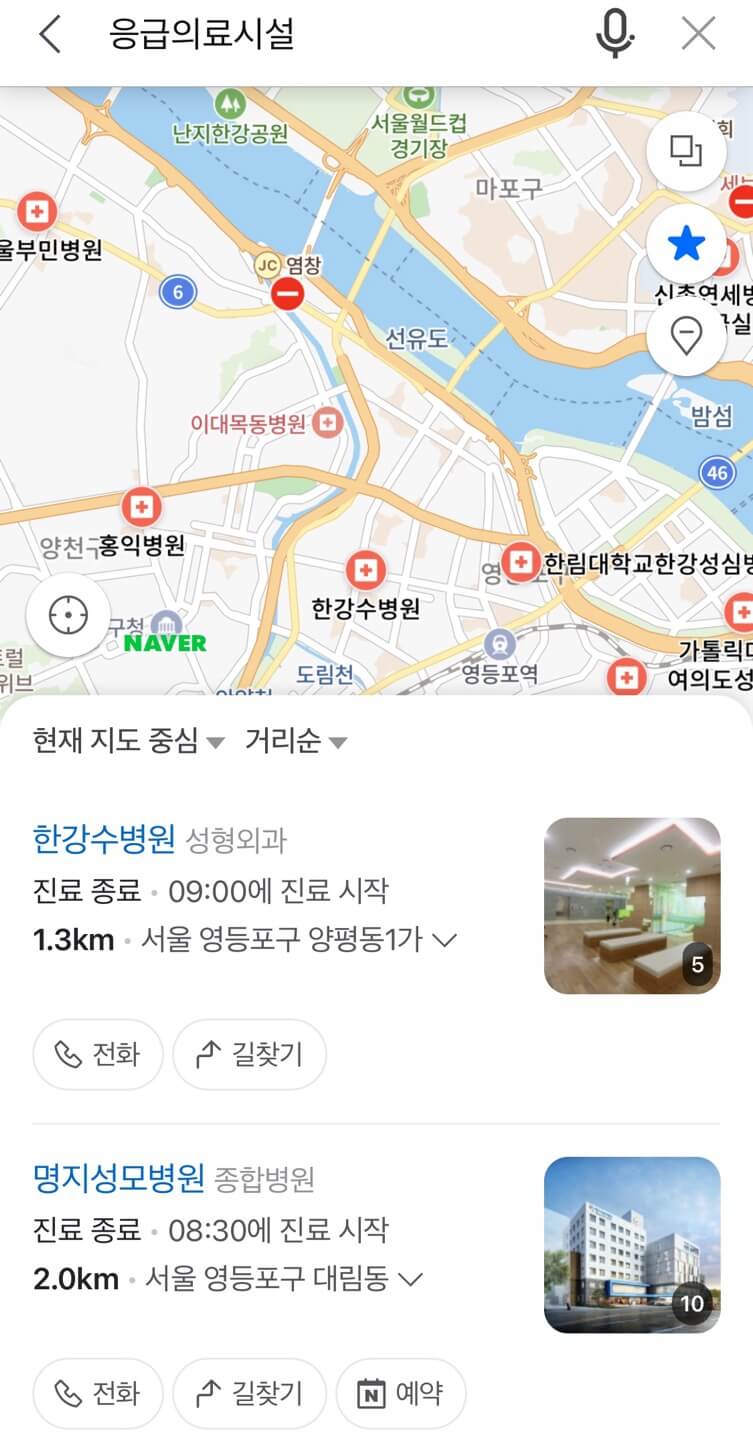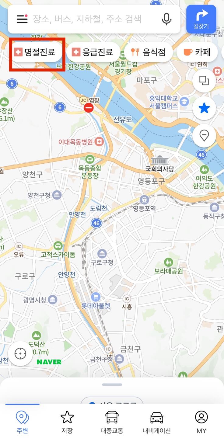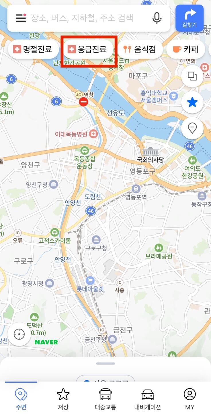 네이버지도를 설치했다면 특별히 설정을 하지 않아도 명절진료응급진료 탭이 현재 추가되어 있습니다.