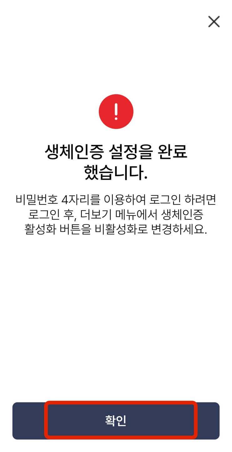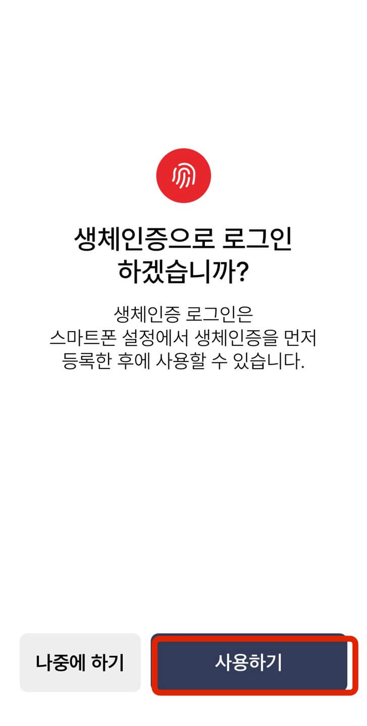 비밀번호 네 자리 누르는 것을 두 번 진행하면 가운데 그림처럼 생체인증 로그인을 하겠냐는 문의가 나옵니다. [사용하기]를 누른 후 다음 화면에서 [등록하기]를 누르면 자동으로 진행됩니다.
