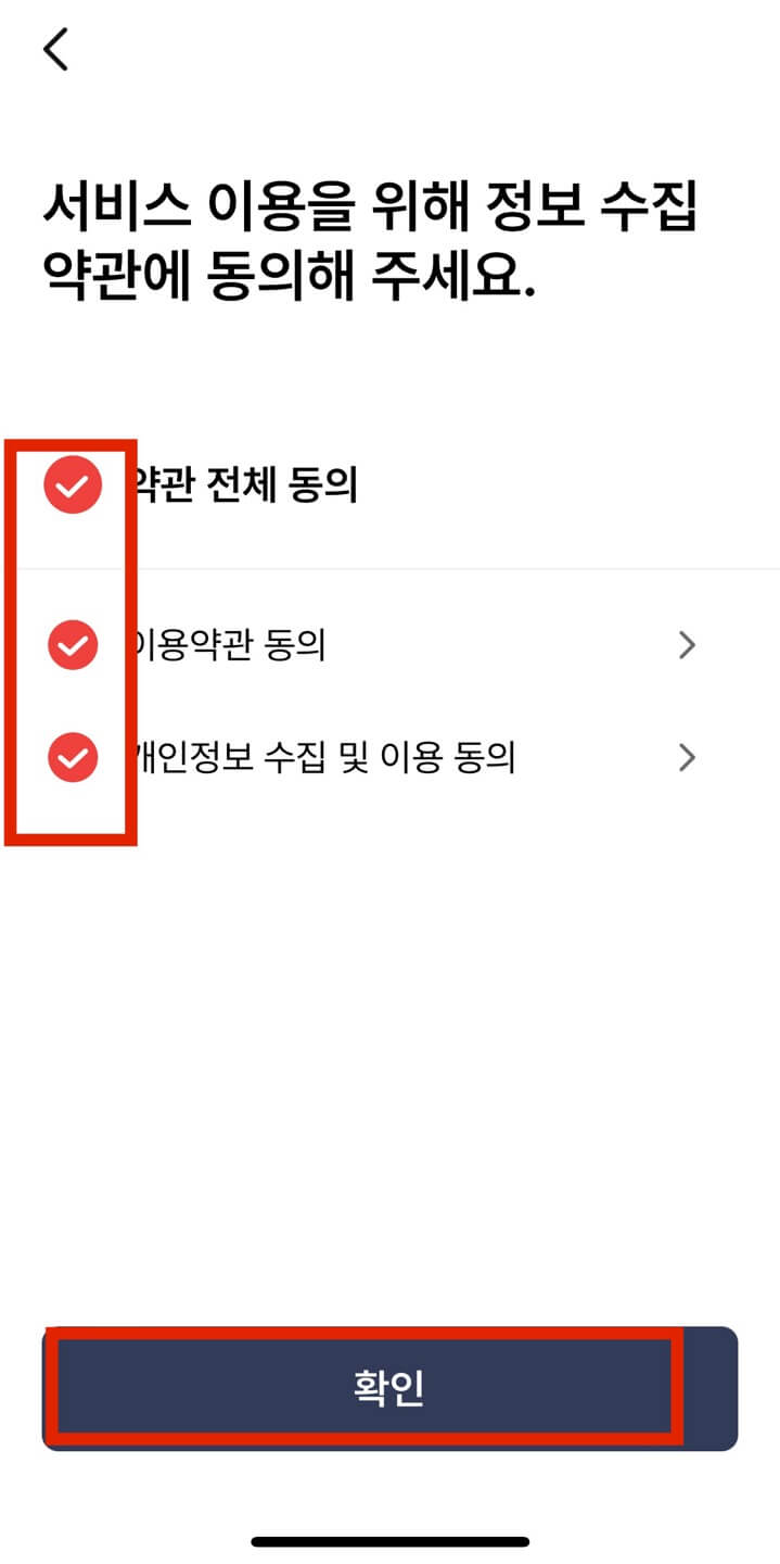 다음은 생체인증 로그인에 대한 권한을 주겠냐는 질문이므로 [확인], 정보 수집 약관 동의에 [약관 전체 동의] 체크 후 [확인]을 선택합니다. 가장 오른쪽 그림처럼 [본인확인 하기]를 눌러 본인인증을 진행합니다.