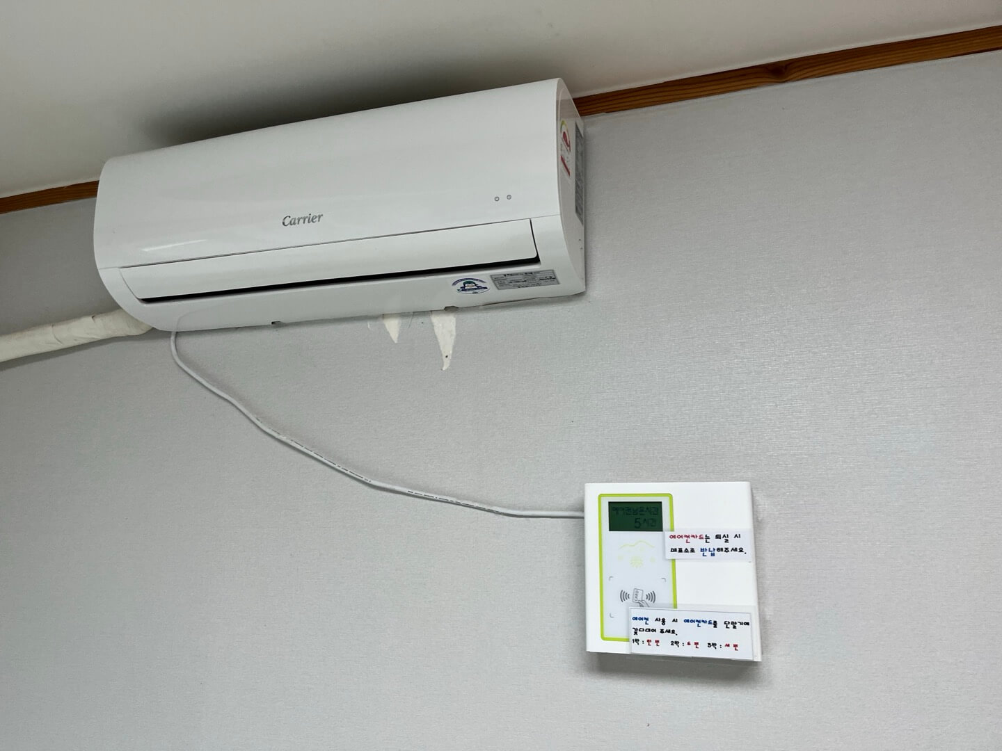 오른쪽 사진은 벽걸이형 에어컨인데요, 이건 객실 이용료와 별도로 결제해야 이용이 가능합니다. 홈피에지에서 객실 이용료 결제시 선택하여 결제하면 되는데요, 객실 열쇠 받을 때 받는 플라스틱 카드를 찍어서 사용하는 형식입니다.