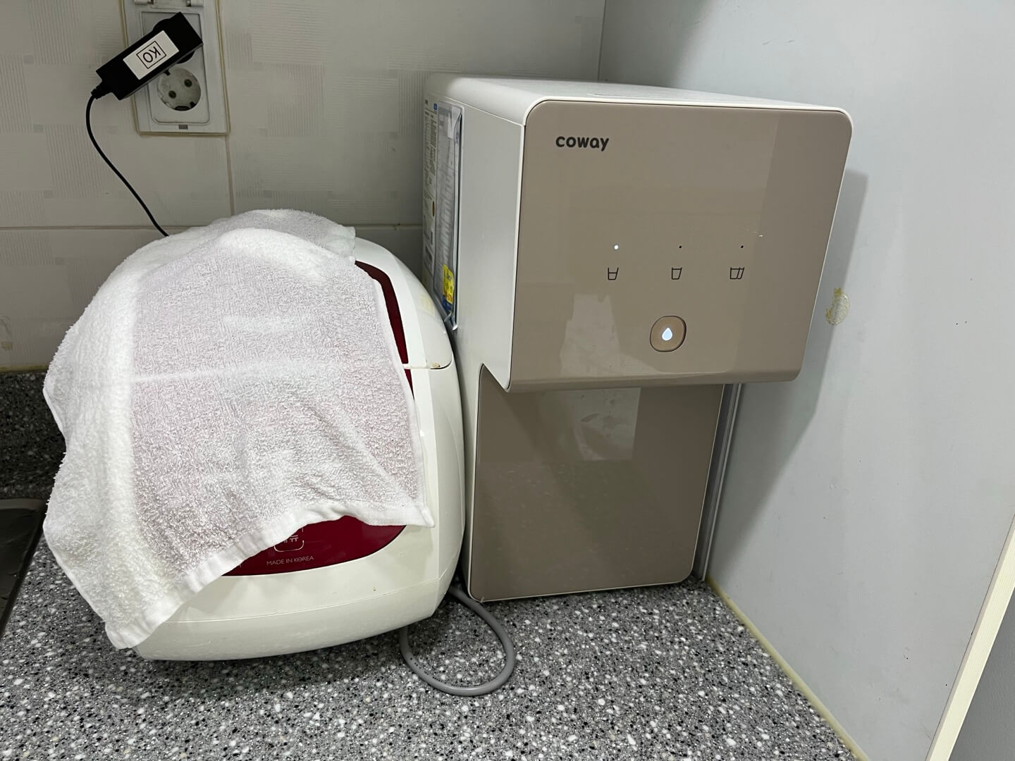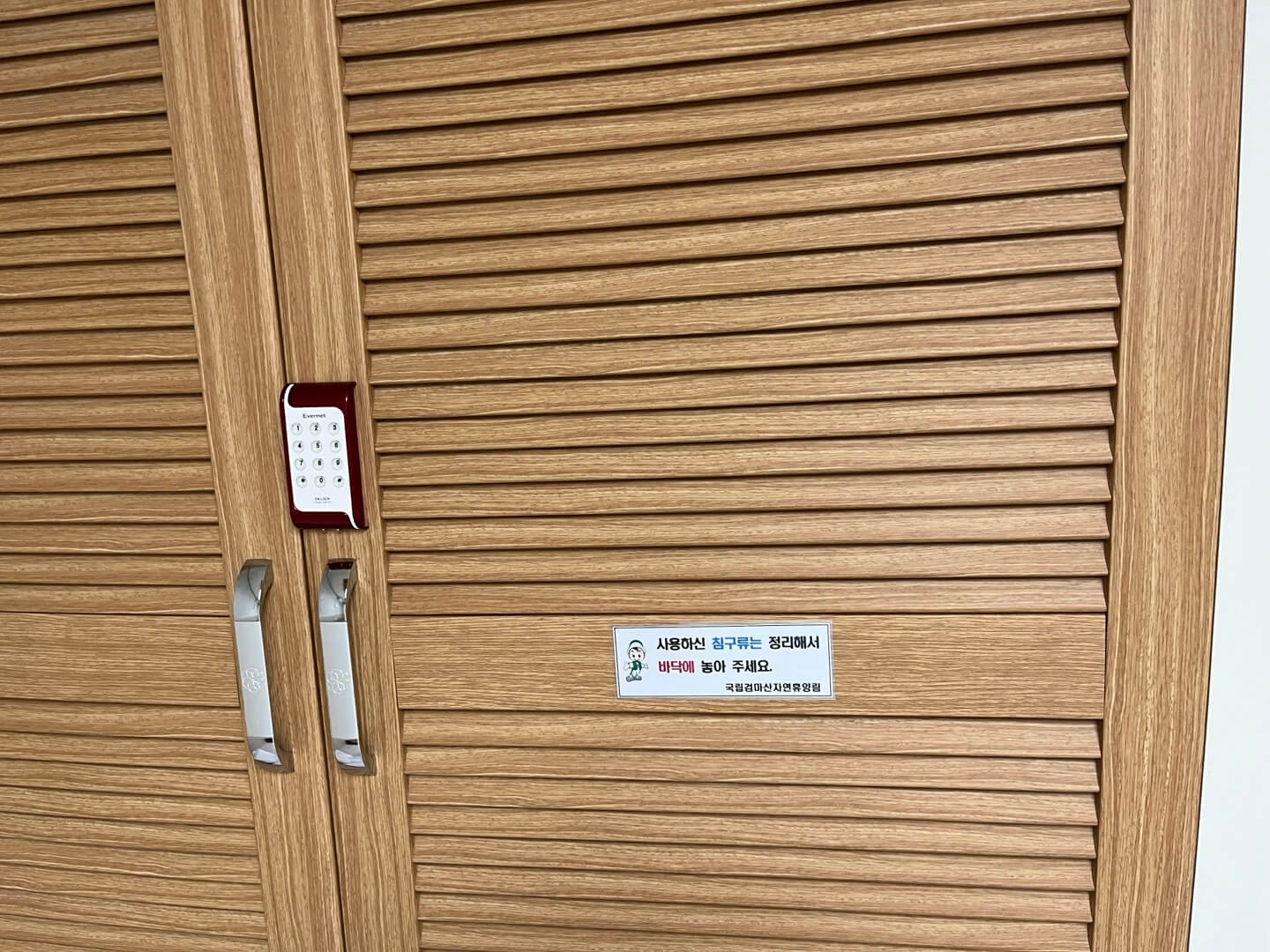 그래도 소형 인버터와 밥솥, 정수기 등이 있었는데요, 굉장히 놀란 것은 방 안에 정수기가 있다는 사실이었습니다. 사실 미리 물을 사갔어야 했는데 못 사갔다고 후회하던 중이었는데 정수기가 구비되어 편리하게 이용할 수 있었습니다. 옷장에는 깨끗하게 세탁된 침구가 있었는데요, '사용한 침구는 안에 넣지 말고 정리해서 옷장 밖에 내놓으라'는 문구가 더욱 믿음이 갔습니다.