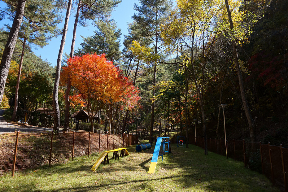 | 검마산 자연휴양림 숙소 건물(홈페이지 캡쳐) | 반려견 놀이터(홈페이지 캡쳐) |