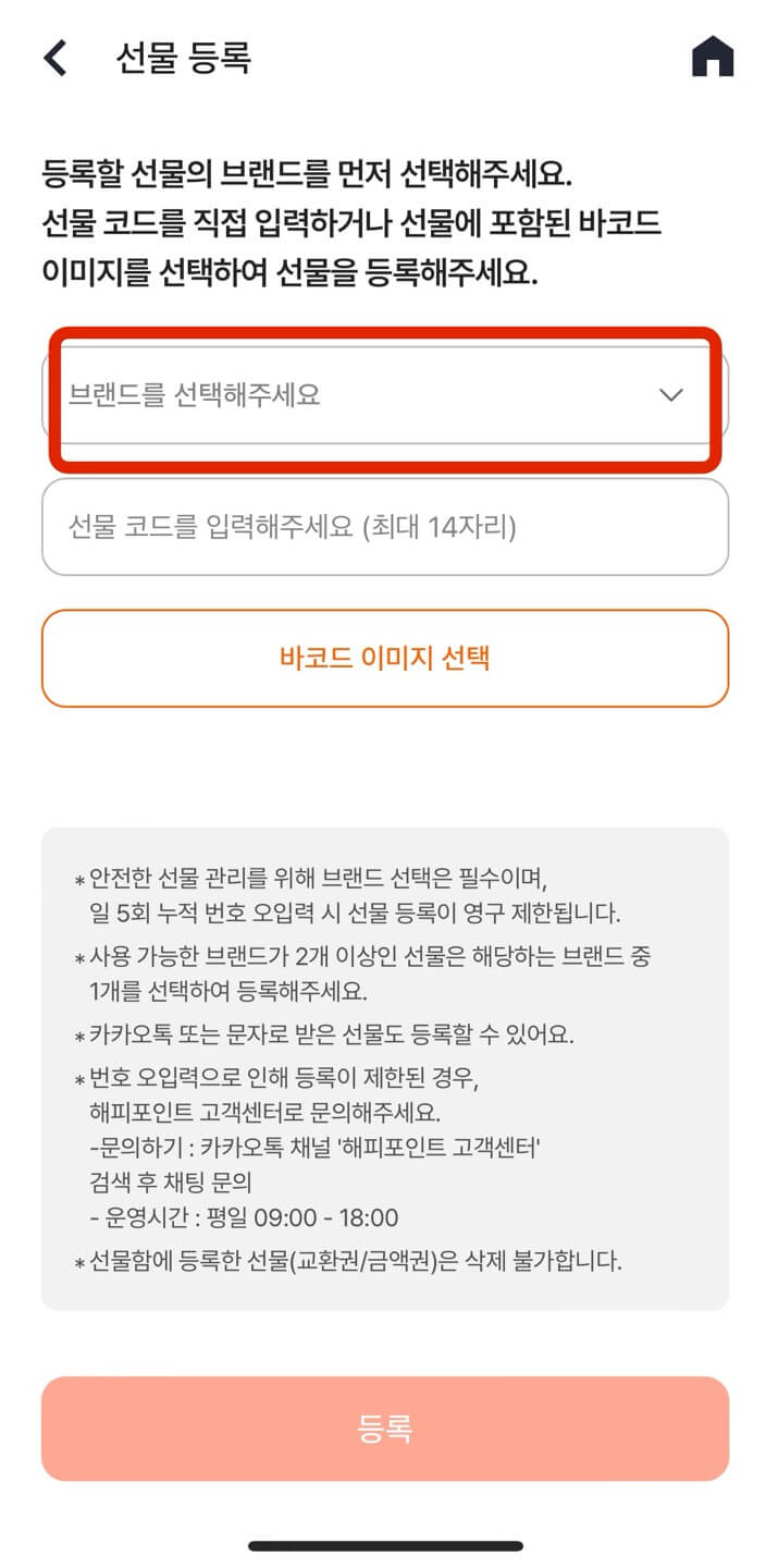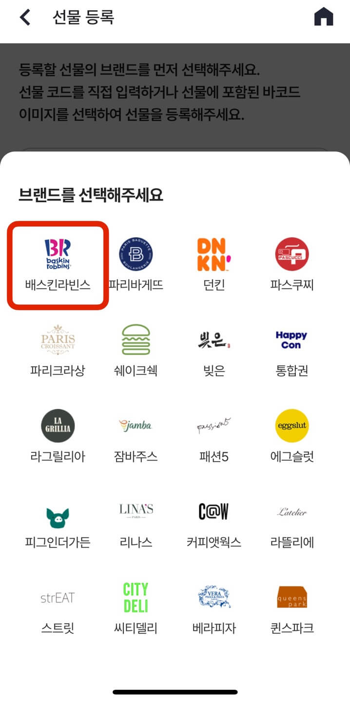 다음, [받은 선물 등록] - [브랜드 선택]창에서 [배스킨라빈스]를 클릭합니다.