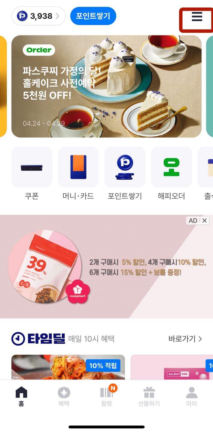 1번과 같은 해피포인트 어플화면에서 우측 상단 [줄 세개] - [선물함] - [+]를 차례로 선택합니다.
